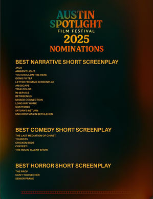 From bold indie films to powerful screenplays, these nominees represent the creativity and spirit that make Austin unforgettable. Winners will be announced live on September 20th at Southwest Theaters Lake Creek 7.